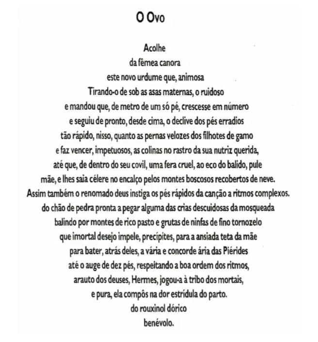 Na tradução feita por José Paulo Paes, podemos perceber que o poema fala sobre o nascimento do próprio canto, utilizando versos que imitam o formato de um ovo. Dessa forma, há um diálogo entre a forma e o conteúdo, reforçando a ideia da origem e do surgimento.