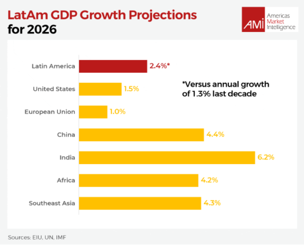 Do ponto de vista econômico, a América Latina deve crescer mais do que Estados Unidos e Europa em 2026, mas ainda ficará atrás de outros mercados emergentes.