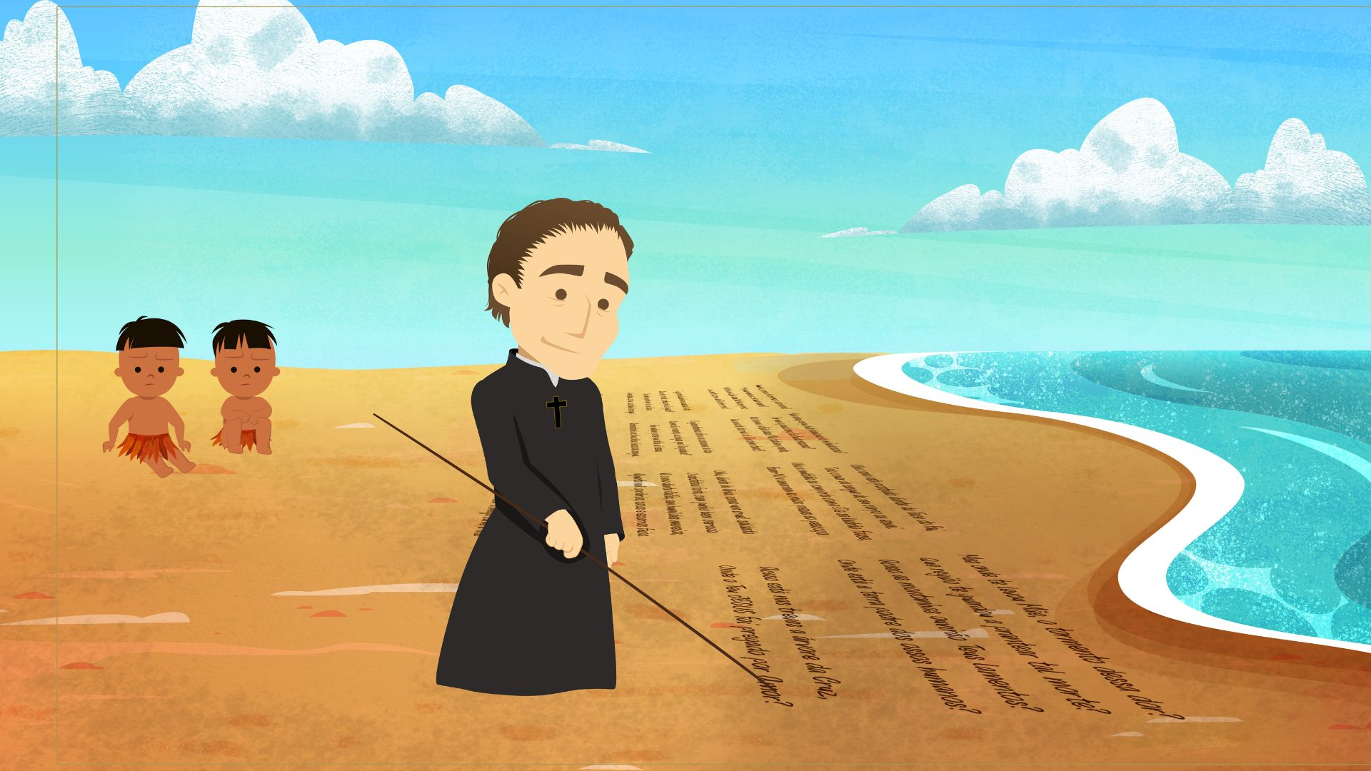 O jovem jesuíta que dedicou sua vida à missão de educar, aprender a língua tupi e aproximar culturas diferentes. Em Pindorama, Anchieta surge como um homem de fé, mas também como alguém que aprende com os povos indígenas e mostra às crianças a importância do diálogo e do conhecimento.