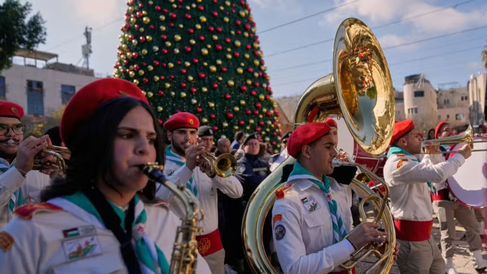 Escoteiros desfilaram pelas ruas estreitas com uniformes e cânticos natalinos, enquanto uma grande árvore decorada ostenta bolas vermelhas e douradas ao lado da basílica.
