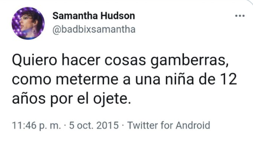 A reportagem também aponta outro tweet, de 2014, em que Samantha diz: