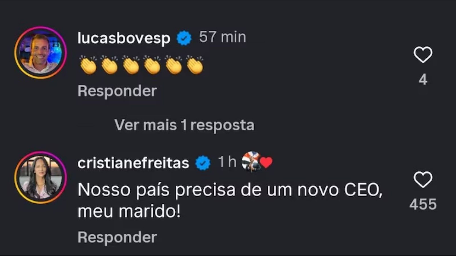 Em uma postagem do governador nas redes sociais, ela comentou que “nosso país precisa de um novo CEO, meu marido”. Tarcísio curtiu o comentário.
