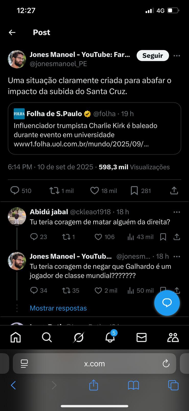 O influenciador Jones Manoel, conhecido por defender a ideologia comunista nas redes sociais, fez uma publicação ironizando o assassinato de Charlie Kirk.