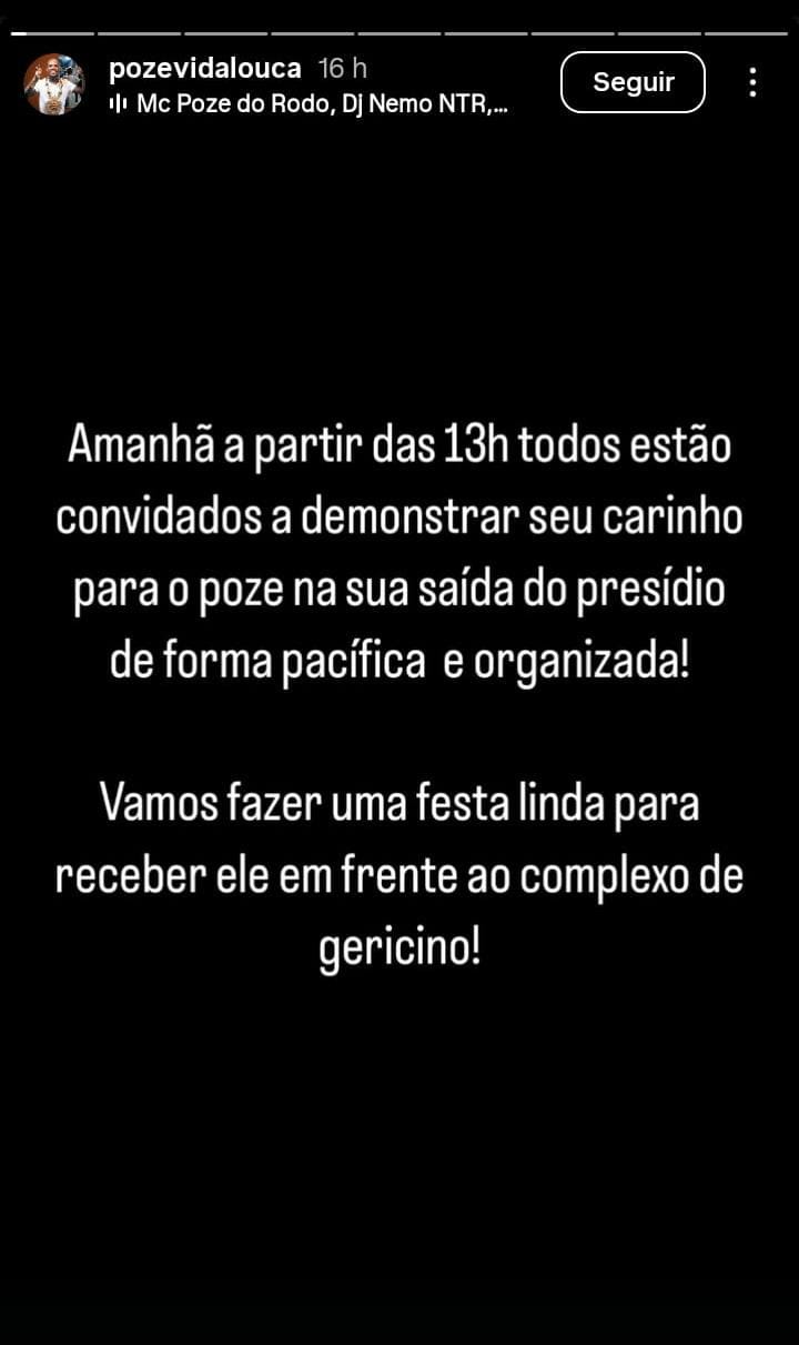 A equipe de Poze usou o Instagram para convidar os fãs para uma "festa" em frente ao Complexo Penitenciário de Gericinó.