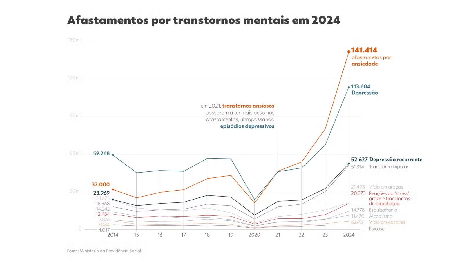 Especialistas atribuem esse aumento à crescente pressão no ambiente de trabalho, às incertezas econômicas e aos efeitos residuais da pandemia de COVID-19.