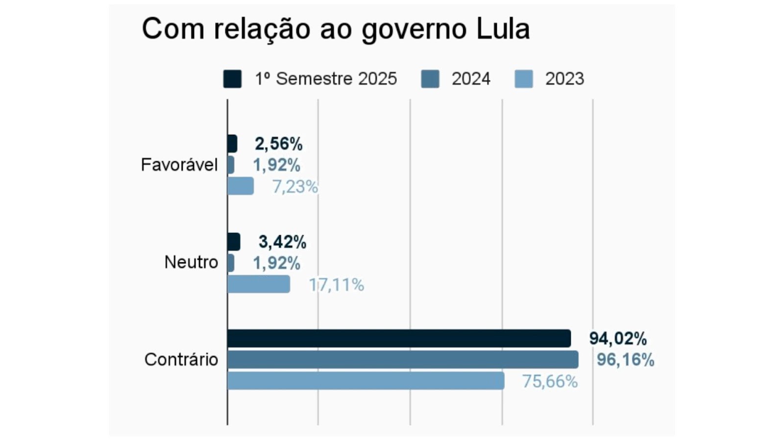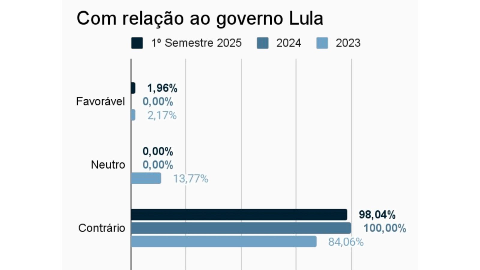 Enquanto isso, foi registrada uma queda no número de editoriais contrários à gestão Lula, o número caiu para 94,02%.
