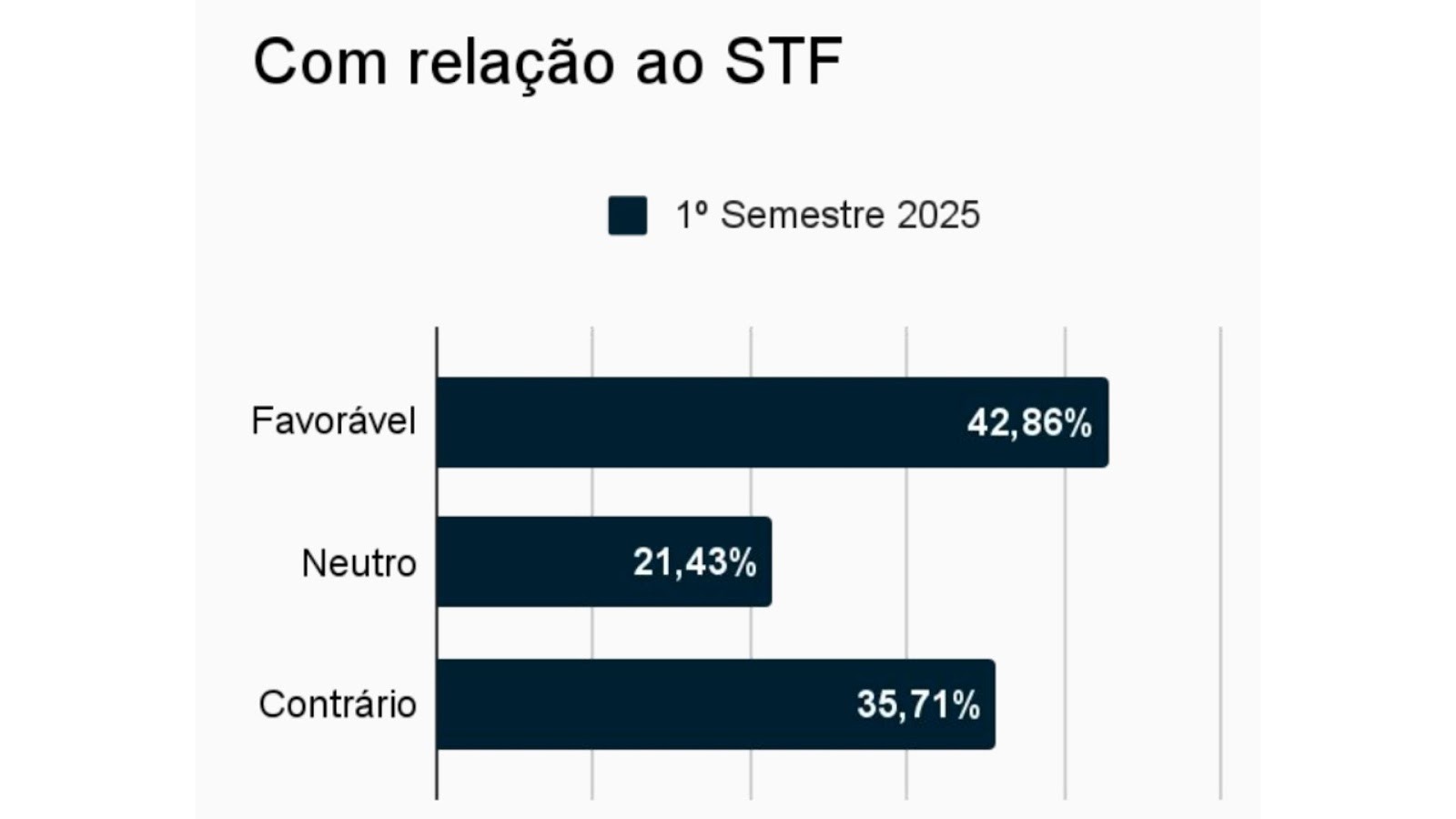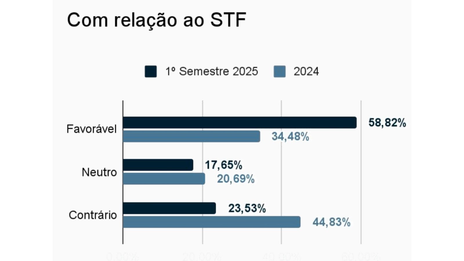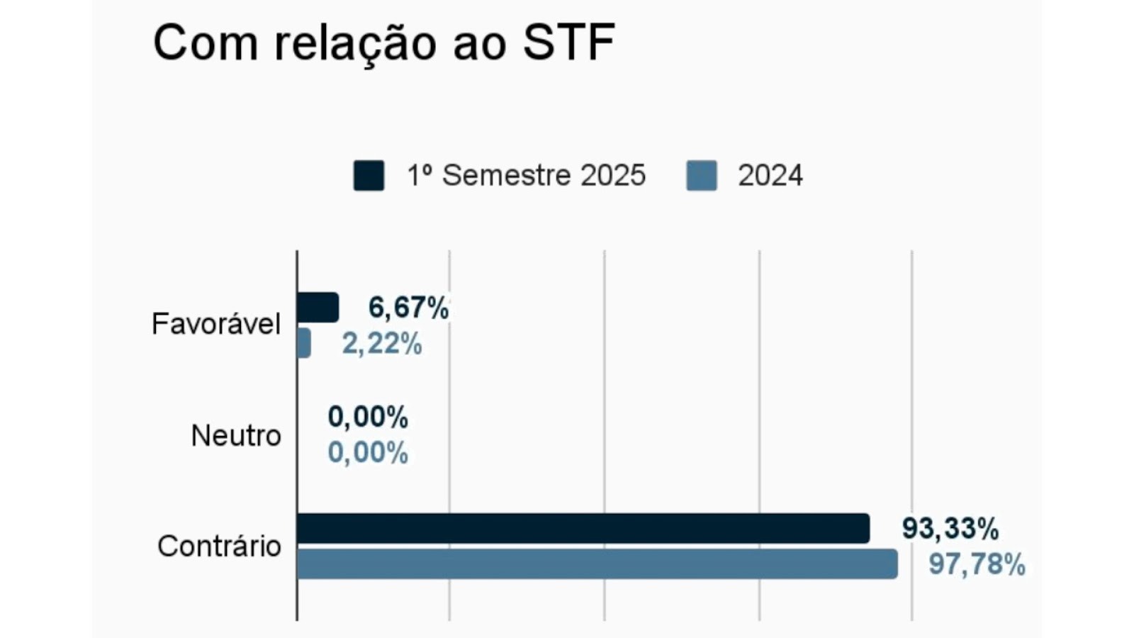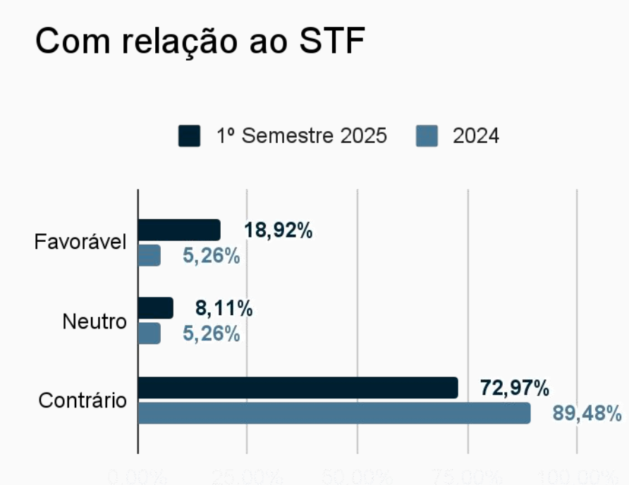 Em 2024, 97,78% dos editoriais colocaram o jornal de maneira contrária à Corte, em 2025 o número vai para 93,33%. Enquanto isso, o número de posições favoráveis subiu de 2,22% para 6,67%.