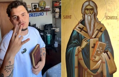 A mão segura ou indica uma cruz, sinalizando que o santo enfrentou dificuldades ou perseguições ao longo da vida, mantendo fidelidade à fé cristã.