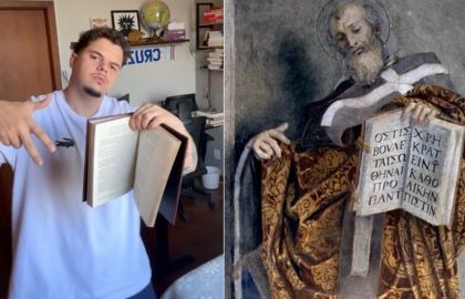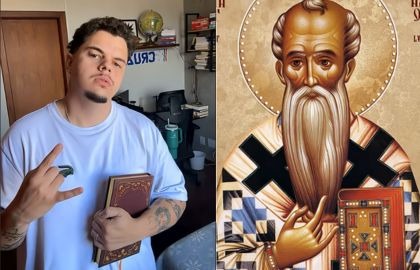 A imagem retrata Atanásio de Alexandria, bispo cristão do século IV.