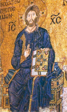 Comum no mundo antigo para marcar a fala direta do orador. Nos ícones, a mão direita de Cristo costuma aparecer em gesto de bênção, seguindo um padrão de origem grega.