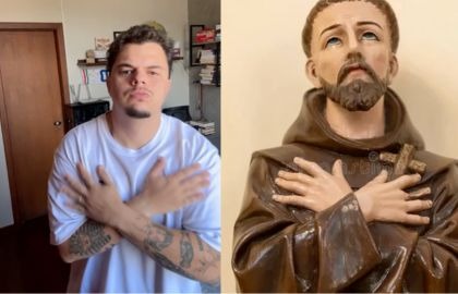 Essa imagem mostra uma postura comum nas representações de São Francisco de Assis, santo do século XIII. A posição está ligada ao relato dos estigmas, marcas das chagas de Cristo que, segundo a tradição, teriam aparecido em seu corpo.