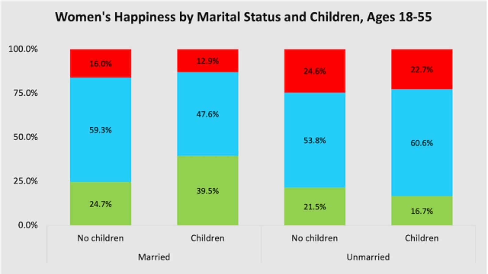 Segundo o levantamento de 2022, 40% das mulheres entre 18 e 55 anos que são casadas e têm filhos se consideram "muito felizes". Entre as casadas sem filhos, esse percentual cai para 25%.