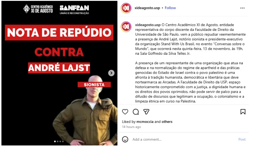 O grupo também acusou Lajst, judeu e presidente da ONG Stand With Us, de representar discursos que “legitimam a ocupação e a limpeza étnica”.